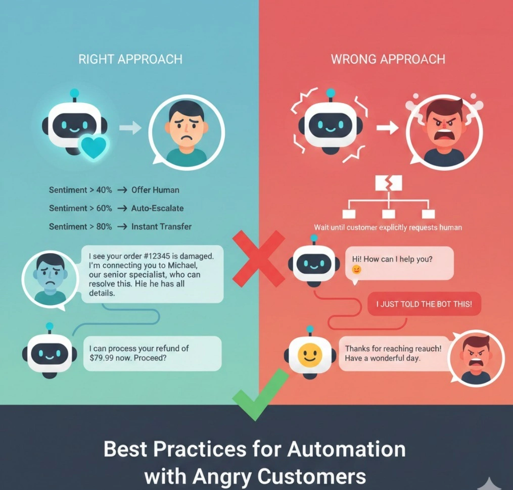 The key isn’t whether automation can handle angry customers. It’s how you design your system to recognize frustration instantly and respond appropriately.