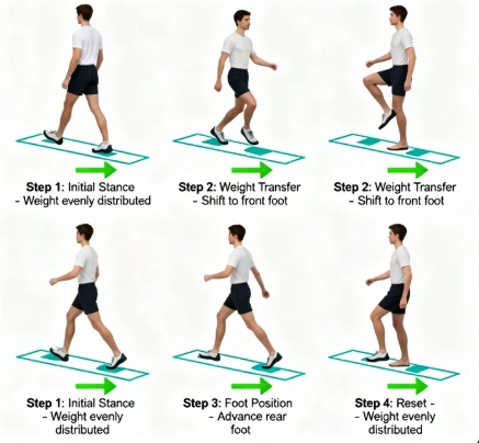 • Step 4 — Shift weight forward: Only after the foot is fully planted, slowly transfer your weight forward onto the front leg. Your hips and waist should guide the movement.